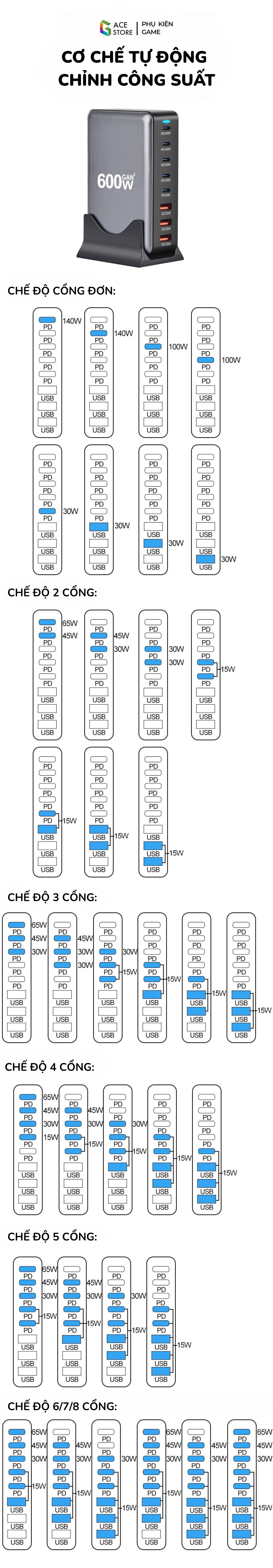 ⚙️ Tùy Chọn Công Suất Đa Dạng (Khi Sạc Tất Cả Các Cổng)
